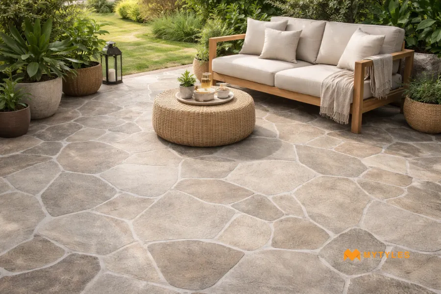 Stone-look tiles work well on terraces because they can take rain, sunlight, and changing temperatures without getting damaged. They feel solid underfoot and give the terrace a clean, modern look.